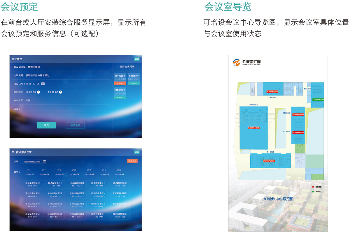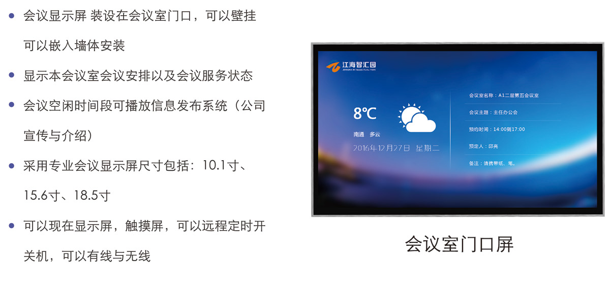 1:在會(huì)議(yì)室門(mén)口按照(zhào)會(huì)議(yì)顯示屏,顯示會(huì)議(yì)室所有(yǒu)預定和(hé)服務信息